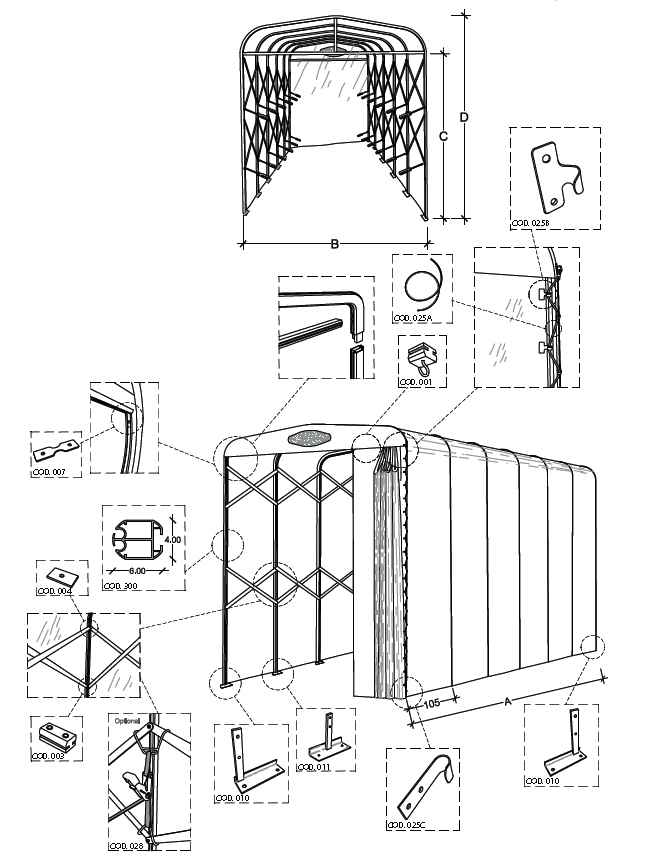 Außerdem gibt es zwei Schiebevorhänge aus dem gleichen Material sowie zwei Giebelflächen mit eingearbeiteten, mikrogelochten Material zur Entlüftung. Zur Befestigung der Garage mit dem Boden werden an den Enden der einzelnen senkrechten Profilstreben Bodenverankerungselemente angebracht. Diese werden dann mit dem Boden verschraubt.