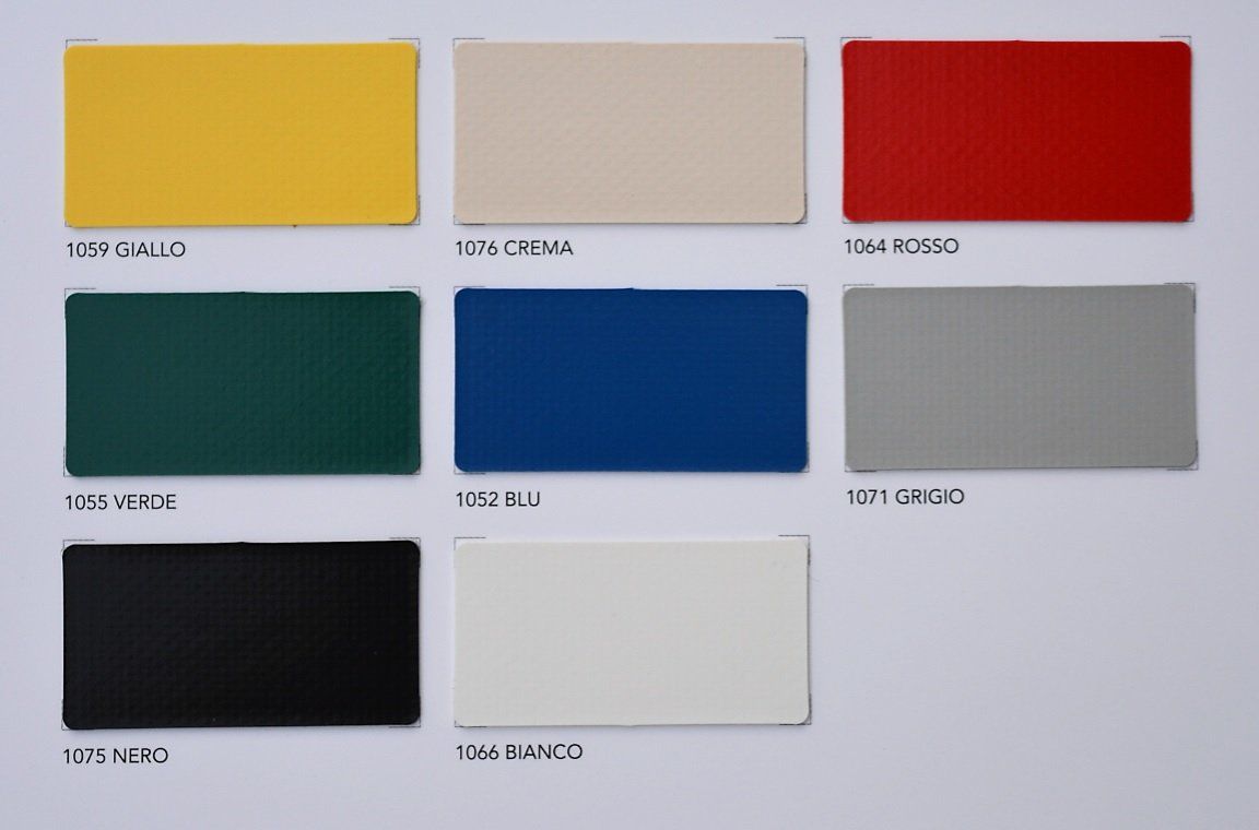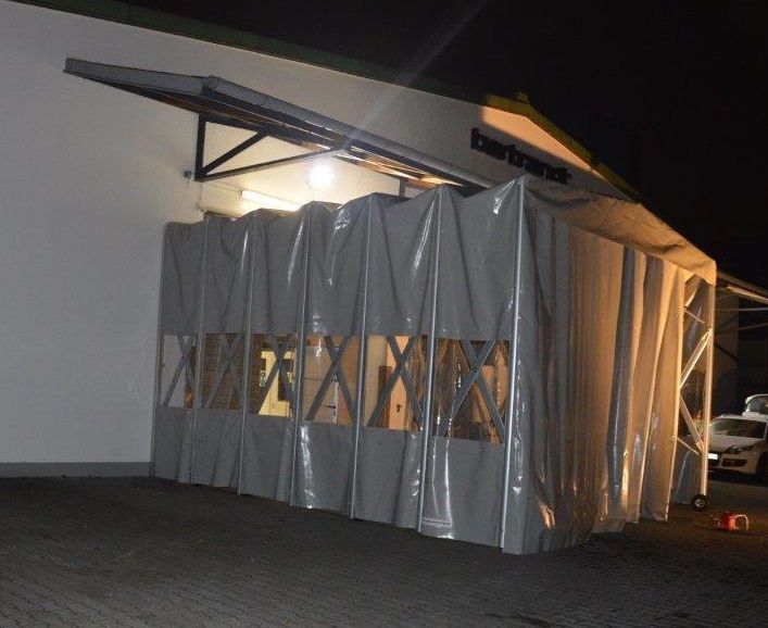 Die Plane besteht aus einem witterungsbeständigen PVC-Gewebe mit 670g/m². Optional kann eine schwer entflammbare B1 Plane verwendet werden.