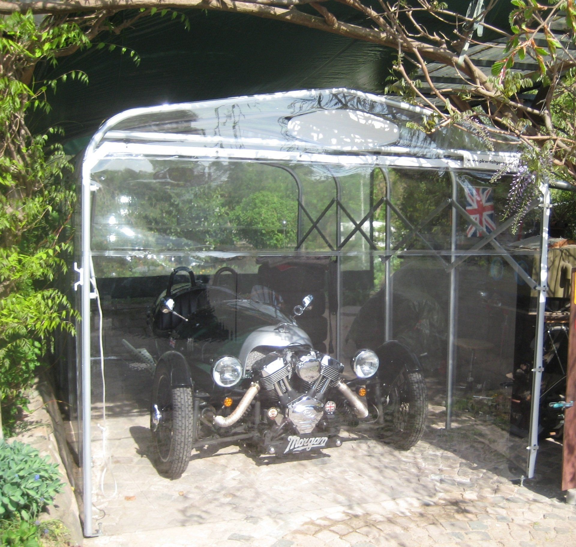 Die Faltgaragen bestehen im Einzelnen aus einem Alu-Profilgestell mit innenliegenden, seitlich angeordneten Kreuzstreben zur Stabilisierung und einer Gewebe PVC-Plane mit 550g/m², ähnlich den LKW-Planen.
