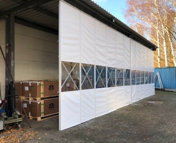 Neben den gezeigten Garagen- und Tunnellösungen bieten wir auch Überdachungen für diverse andere Möglichkeiten an. So zum Beispiel die halbseitigen Überdachungen für das schnelle Überdachen im Außenbereich, eine flexible Behälterüberdachung, Faltwände für den Innen- und Außenbereich bis hin zu Poolüberdachungen.